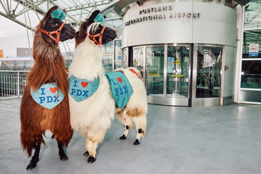Since 2023, therapy llamas from the nonprofit Mtn Peaks Therapy Llamas & Alpacas have made scheduled visits to Portland International Airport.