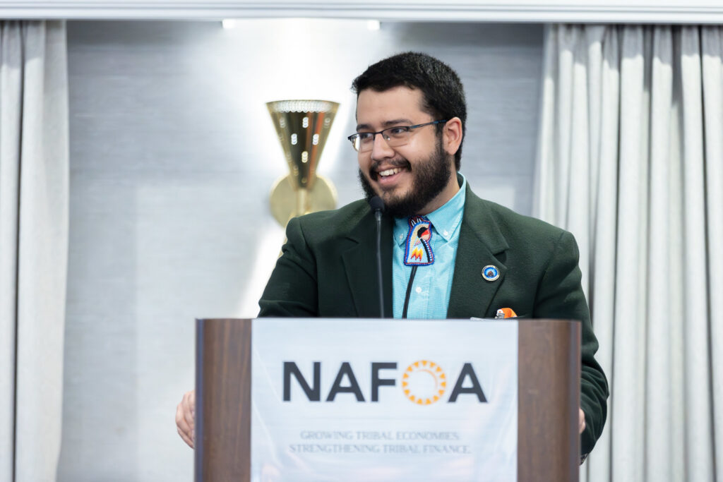 Maximillian at the podium introducing himself to the NAFOA community during the 2025 Fall Finance & Tribal Economies Conference, held after the Leadership Summit