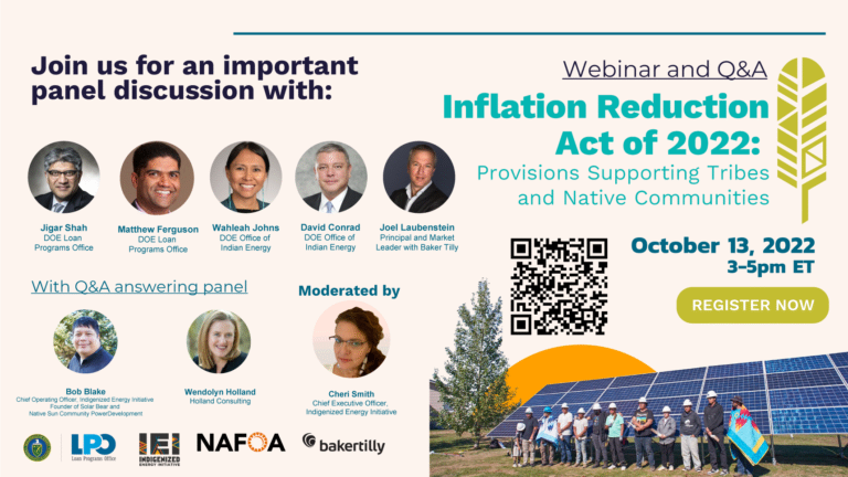 Join staff of the Department of Energy, Indigenized Energy Initiative (IEI), and Baker Tilly to discuss the various programs and possibilities created by the Inflation Reduction Act of 2022. This webinar will be today on October 13 from 3-5pm ET