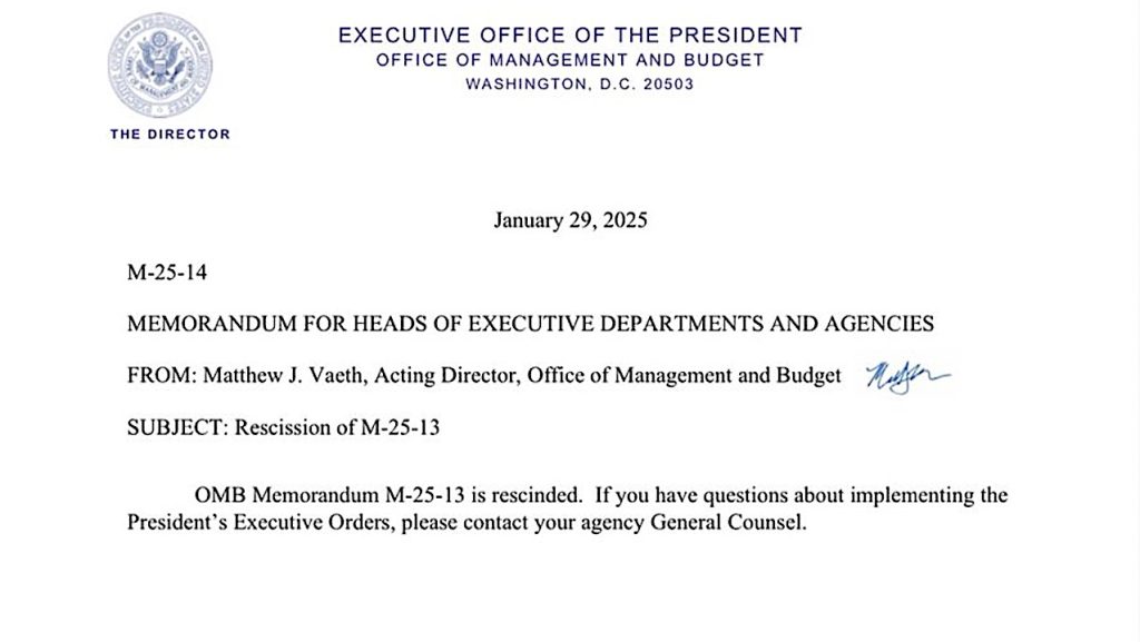 OMB Memorandum M-25-14: “OMB Memorandum M-25-13 is rescinded. If you have any questions about implementing the President’s Executive Orders, please contact your agency General Counsel.”